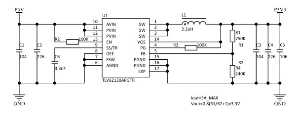 电源管理采用的是TLV62130ARGTR芯片,该产品是TI出品的一款高效率、宽输入电压、同步降压转换器,非常适合本项目对3.3V稳压供电的需求。其部分原理图如图2.2所示。