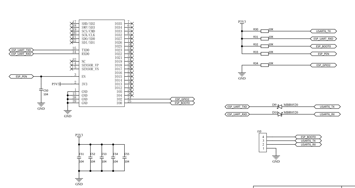 滤波:ESP32 供电引脚附近需布置多个 0.1uF + 10uF 去耦电容