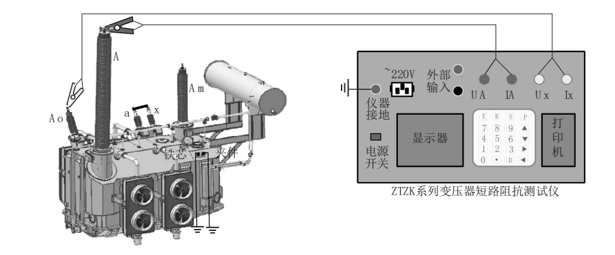 (3) 进行高压绕组对低压绕组短路阻抗试验时, 试验接线如图 1 - 11 所示, 测试 仪 UA、 IA 引出的测试线夹子接高压套管 A, UX、 IX 引出的测试线夹子接中性点套管 Ao, 低压绕组 a、 x 短接不接地, 中压套管 Am 悬空。 高压绕组对中压绕组、 中压绕组 对低压绕组短路阻抗试验接线与之类似。 进行高压绕组对中压绕组、 中压绕组对低压绕组短路阻抗试验时, 应分别在最小分接位置、 额定分接位置和最大分接位置下进行