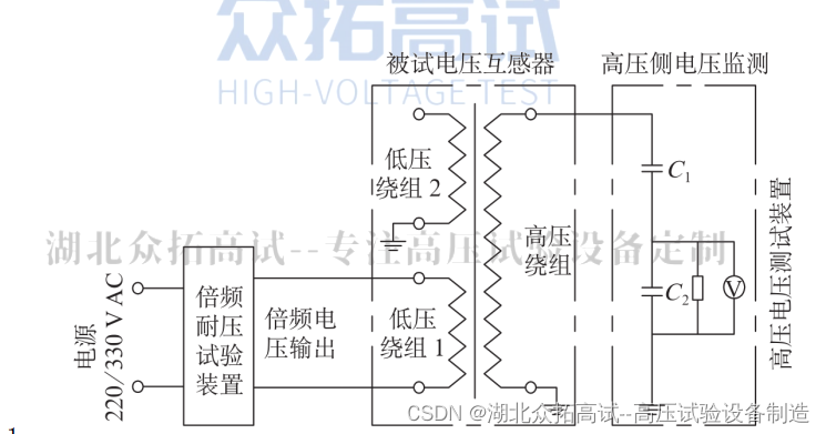 - 按上图接好线, 三倍频发生器、 高压器外壳必须可靠接地。 将三倍频电源发生装置的输出线与被试电压互感器的一组二次绕组接线端连接好(如 a-n 端);