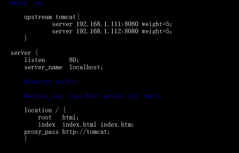 四、配置nginx 在nginx的安装目录下(也就是你安装nginx时 ./configure --prefix=你的nginx目录)的conf/nginx.conf weight表示权重值(50%的几率分别分发到这两台tomcat机器上)