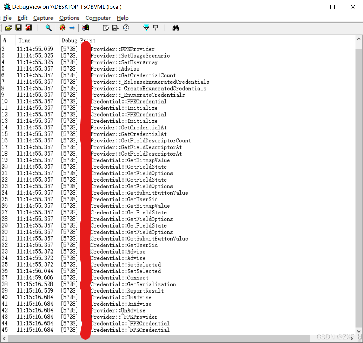 登录验证调用方法栈获取:CredentialProvider接口相关方法较多,官方文档描述不够完善,各个方法之间的调用顺序仅凭官方文档很难理清楚,此处对样例程序中的各个主要方法中加入OutputDebugStringA(__FUNCTION__)对调用的方法名进行打印,在使用登录插件登录验证过程中使用DebugView进行调试信息捕获,从而得到CredentialProvider在具体登录时的调用方法栈,具体如下图与日志所示(图例非匹配,以日志为主):