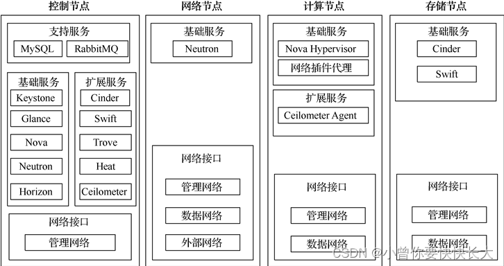 openstack是分布式系统,必须从逻辑架构映射到具体的物理架构。将各个项目和组件以一定的方式安装到实际的服务器(节点)上,部署到实际的存储设备上,并通过网络将它们连接起来,就形成了openstack的物理部署架构。