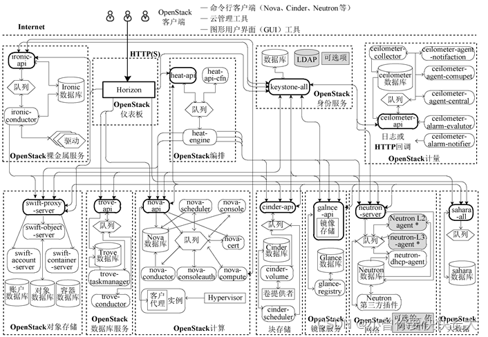 外部组件:sahara&heat大数据用的,分别是数据编排和数据分析;ironic裸金属服务,trove数据库管理服务包含了sql数据库和nosql数据库