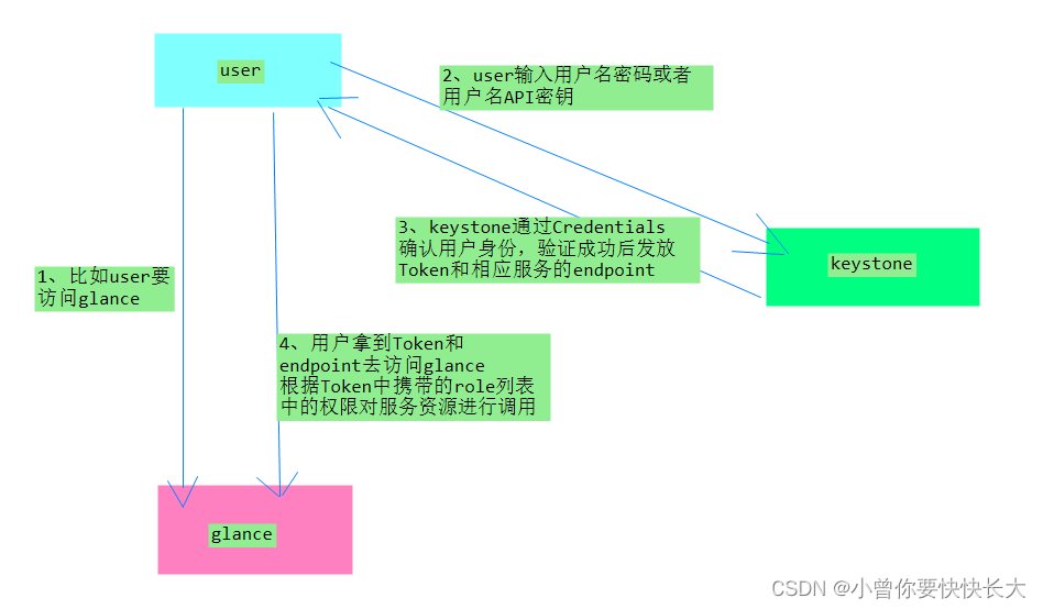 用户第一次请求认证时,需提供用户名和密码或用户名和密钥(API密钥),keystone会给用户分配一个Authentication token 供该用户的后续请求操作,后续请求认证,只需提供由身份服务提供的认证令牌Token即可。(返回的Token中包含user的role列表)