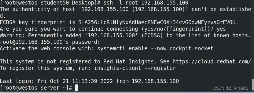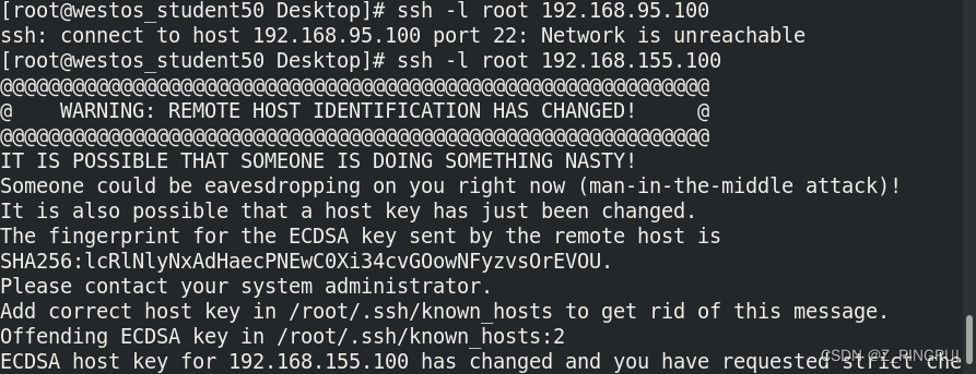 ssh -l root 192.168.155.100 ##再次连接该远程主机(server)时会出现报错