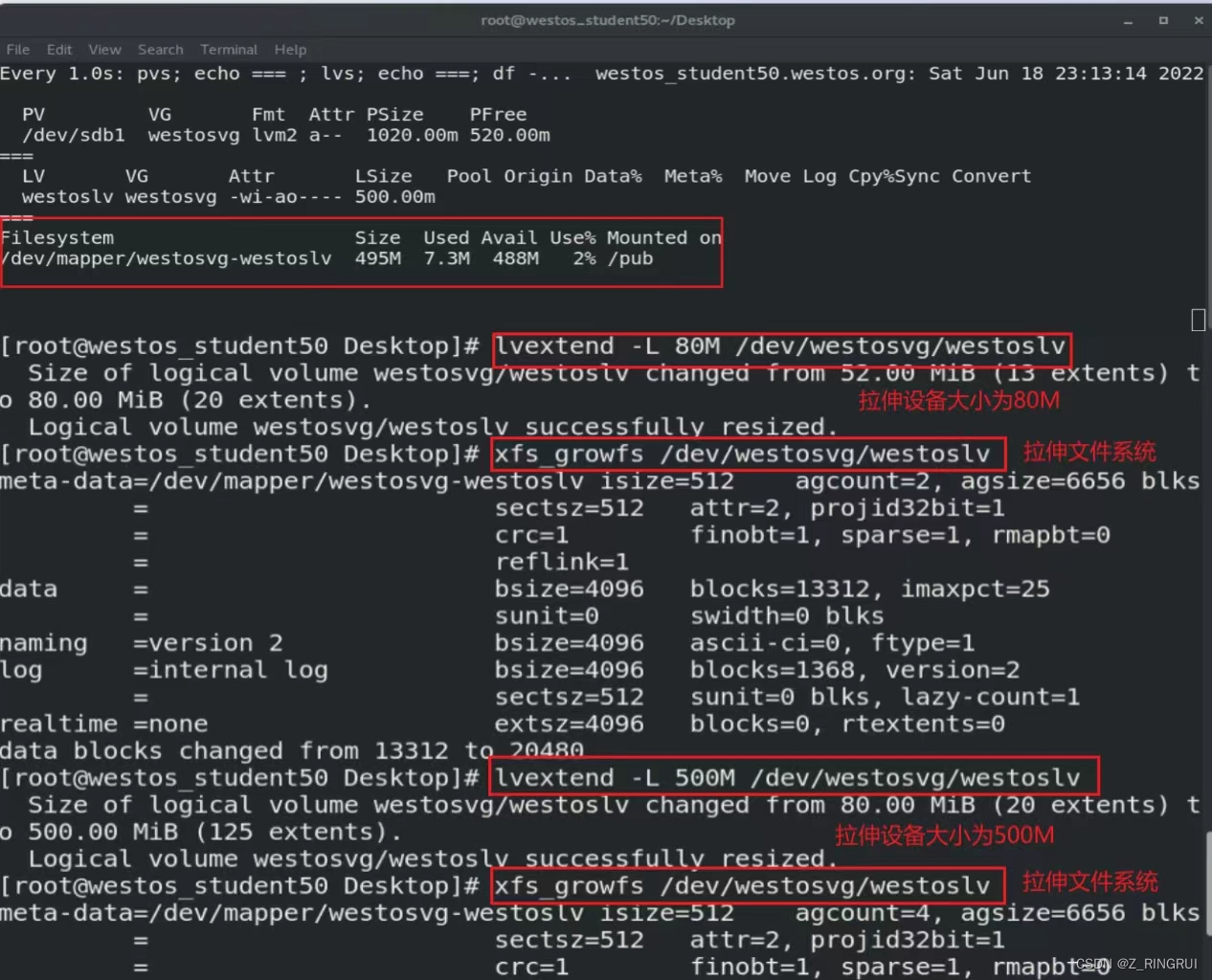 xfs_growfs /dev/westosvg/wesetoslv ##拉伸文件系统,在rhel7中可以用设备或挂载点