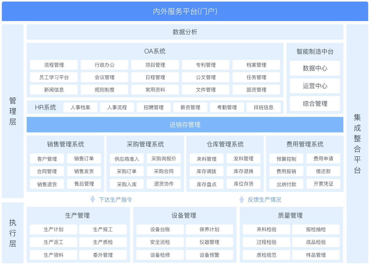 通过JNPF平台,可以有效打通企业管理层、运营层、执行层的信息壁垒,采用管控一体化的方式,上到数据决策、工厂管理,下到销售、采购、生产、仓库、供应商等核心管理内容进行串联,有效帮助生产制造企业降本提效、保障产品质量。