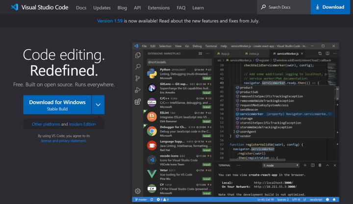 重新定义和优化了代码编辑,以便生成和调试新式 Web 应用程序和云应用程序。也是著名的文本编辑器,它是轻量级的,vSCode的一大特点就是你可以通过多种方式来调整设置,而且Vim可以和VScode集成在一起,它还带有一个集成终端,可用的扩展太多,使开发人员的工作变得更加轻松。我最喜欢的一些扩展是AWS Toolkit, ESLint,Live Server, Live Share, Prettier-代码格式化程序,YAML,Live Sass编译器,Docker等。