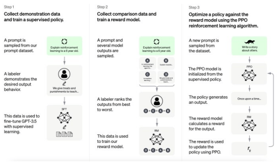 在最后阶段,使用近端策略优化(PPO) 强化学习算法来训练主要的大型语言模型。OpenAI公司没有提供进一步的细节,例如它是否冻结了模型的任何部分,或者它如何确保强化学习训练的模型不会偏离原始分布太多。