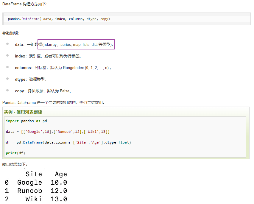 JSON 对象与 Python 字典具有相同的格式,所以我们可以直接将 Python 字典转化为 DataFrame 数据: