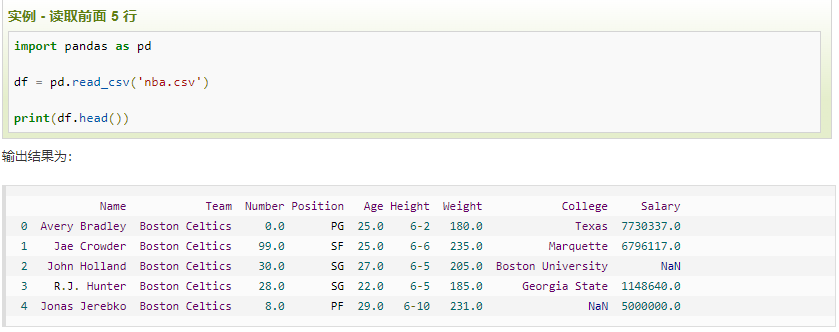 head( n ) 方法用于读取前面的 n 行,如果不填参数 n ,默认返回 5 行。