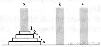 设a、b、c是三个塔座。开始时,在塔座a上有一叠共n个圆盘,这些圆盘自下而上,由大到小地叠放在一起,各圆盘从小到大编号为1,2,…,n,如图所示。现要求将塔座a上的这一叠圆盘移到塔座b上,并仍按同样顺序叠置。在移动圆盘时应遵守以下移动规则: