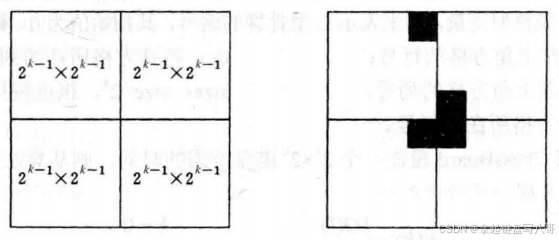 在一个2^k×2^k个方格组成的棋盘中,若恰有一个方格与其他方格不同,则称该方格为特殊方格,且称该棋盘为一特殊棋盘。显然,特殊方格在棋盘上出现的位置有4^k种情形。因而对任何k≥0,有4^k种特殊棋盘。图中的特殊棋盘是k=2时16个特殊棋盘中的一个。