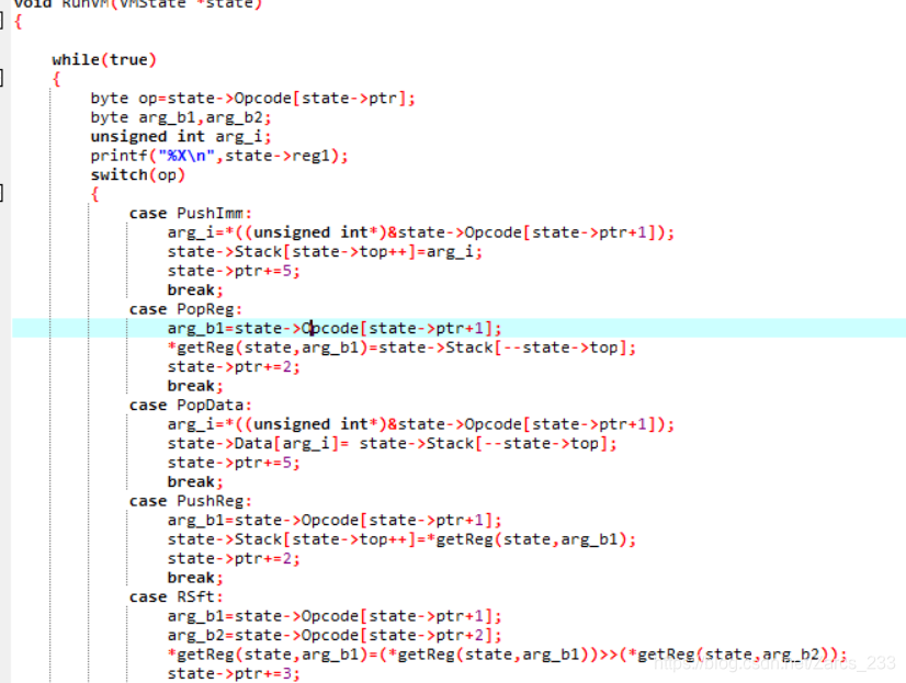所以主要代码就在这里了,然后完善下RunVM函数就可以了。如下就是完整代码,有个Opcode.h没给出不过问题不大,我们不在于写VM而在于怎么实现opcode和asm混杂