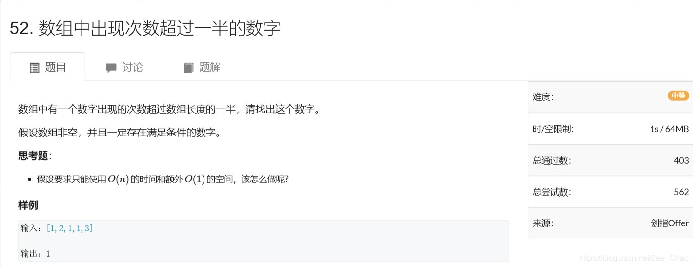 可以发现,满足条件的数字同时也是所有数字中的众数。那么我们可以统计数字的出现次数从而决定哪个数字是符合题意的。当然,这是最原始的方法。然而很多人不愿意使用的原因在于,为了做出相应的统计需要额外开辟空间用来记录。同时哈希表自身的查找也要耗费可观的时间。