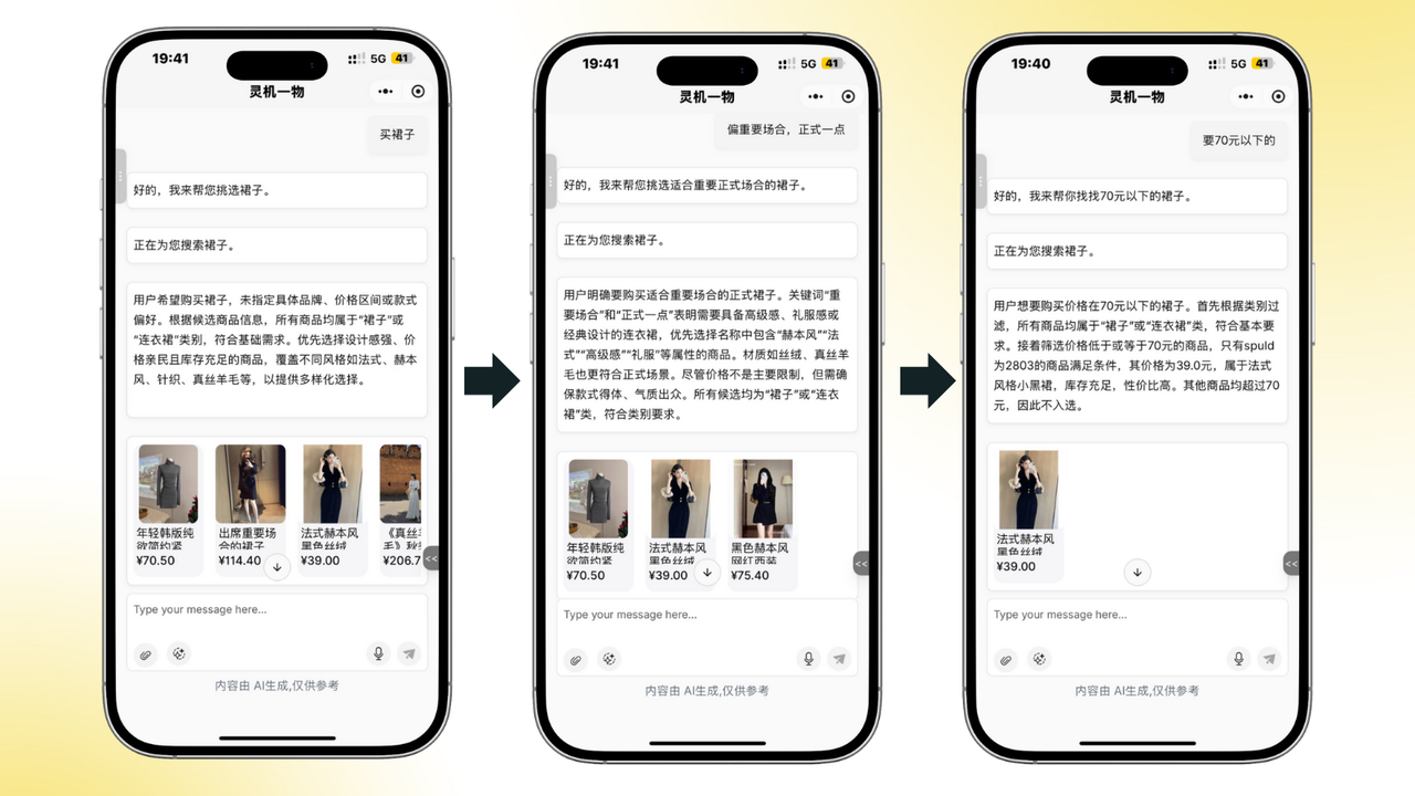 用户起手往往只给出一个大致方向,比如想买裙子的东西,灵机一物会先据此给出一组范围相对宽的候选;随着用户逐步补充颜色、尺寸、使用人群、价格上限等条件,不会每次都从头开始检索,而是根据上下文的语义持续叠加约束,收紧可选空间,同时调整展示的结果。