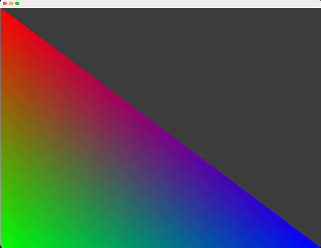 运行程序后,你将看到一个彩虹三角形。尽管仅为三个顶点指定了颜色,但屏幕显示多种渐变色。这是因为渲染管线在光栅化阶段自动进行片元插值:根据片元与顶点的距离,混合顶点颜色,实现平滑过渡。
