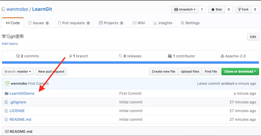 - 5、提交修改,首先切换到LearnGit文件路径: