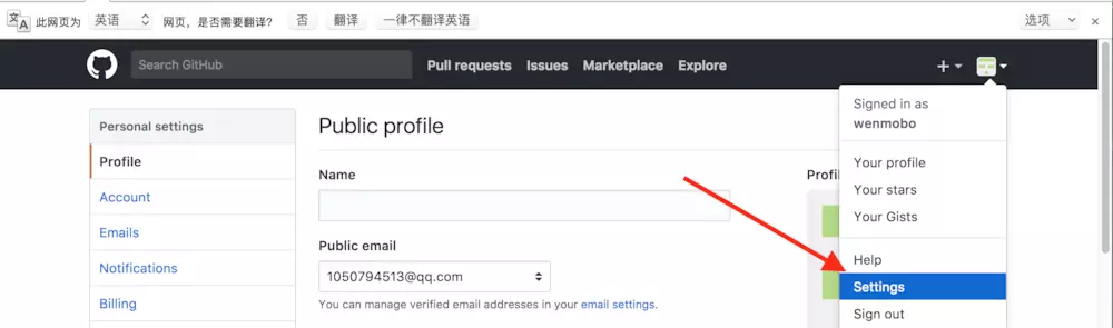 - 3、登录GitHub(默认你已经注册了GitHub账号),添加ssh key,点击Settings,如图