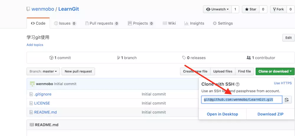 git@github.com:wenmobo/LearnGit.git是刚刚复制的ssh路径。