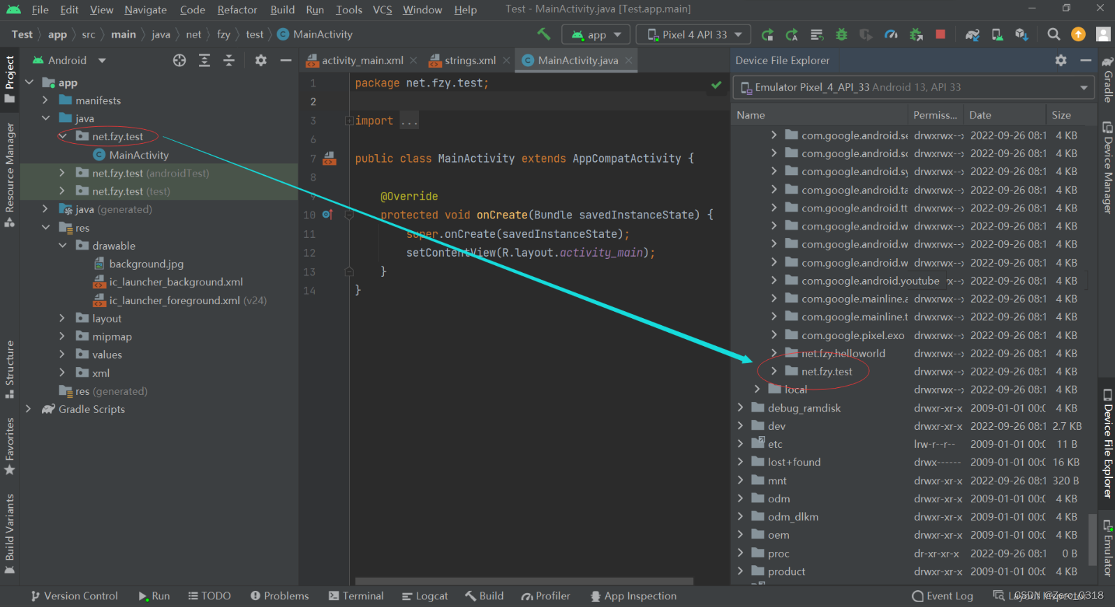点开data/data,找到我们运行的安卓程序:net.fzy.test
