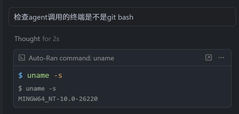 启动这个配置后,重启cursor,在agent中让它帮我检查一下当前是不是git bash。