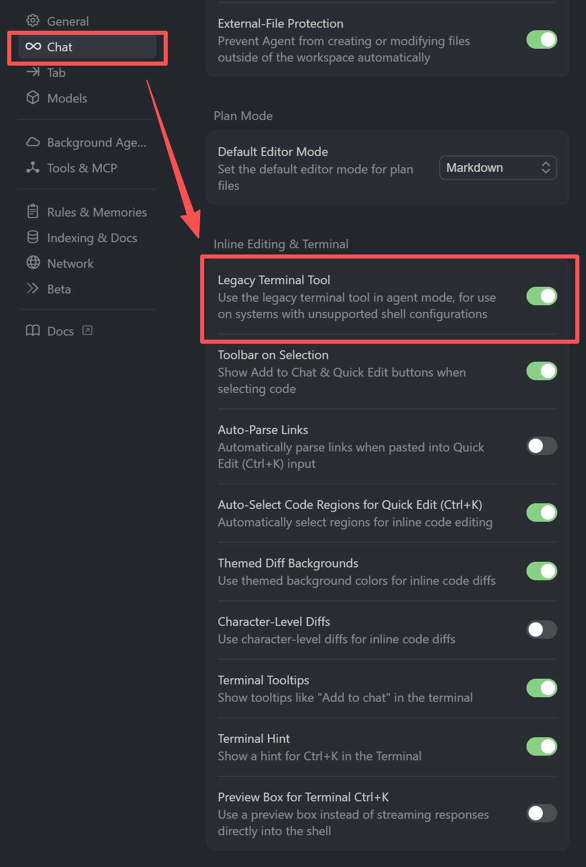 无意中发现新版cursor的设置界面中有一个“legacy terminal tool”配置,holy shit……
