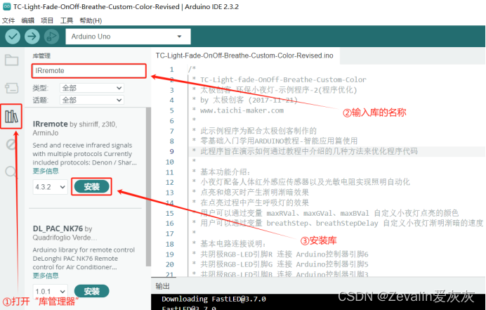 ①IRremote库支持NEC、Sony、Philips RC5、Philips RC6等协议指令,本示例程序中Arduino将通过调用函数sendNEC(0xF7C03F, 32)来发射NEC协议指令,该函数的两个参数中,0xF7C03F为指令信息内容,32位指令信息位数。