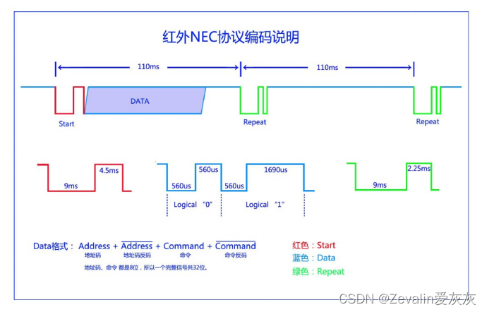 ④发送Data时,前560us低电平,后560us高电平,表示发送数据0;前560us低电平,后1690us高电平,表示发送数据1。