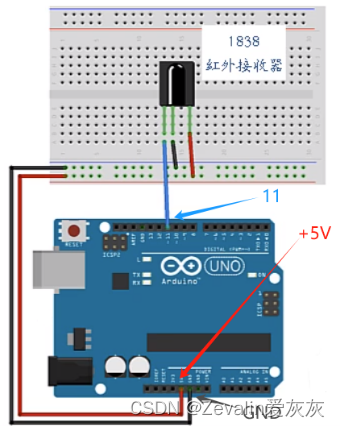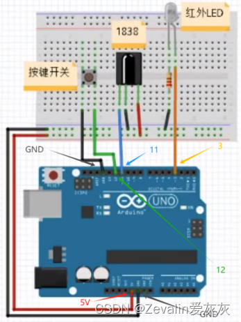 ④调用的发射指令函数默认以引脚3为输出口,所以红外LED的正极接在Arduino的引脚3上。