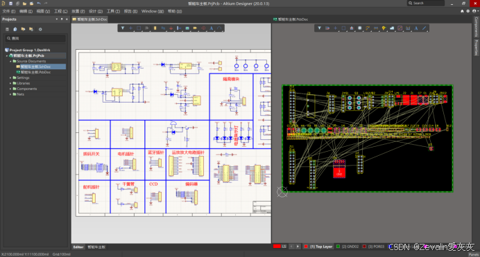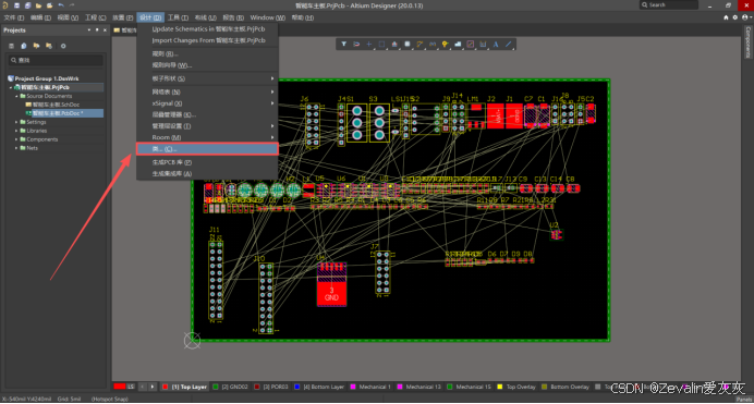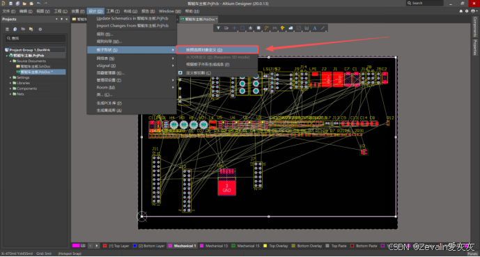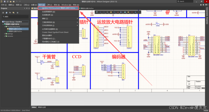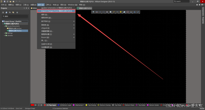 (1)打开原理图文件后,选择菜单栏中的“设计”→“更新”,即可导入原理图至PCB,此操作往往应用于绘制PCB过程中更改原理图后将原理图的变更点同步至PCB。