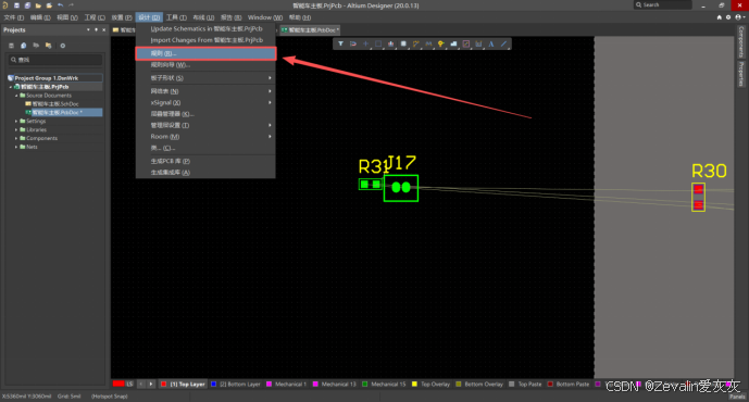 (2)规则变更的步骤为:选择菜单栏中的“设计”→“规则”,在编辑器中将规则变更为项目的要求+PCB必须遵守的规则即可。