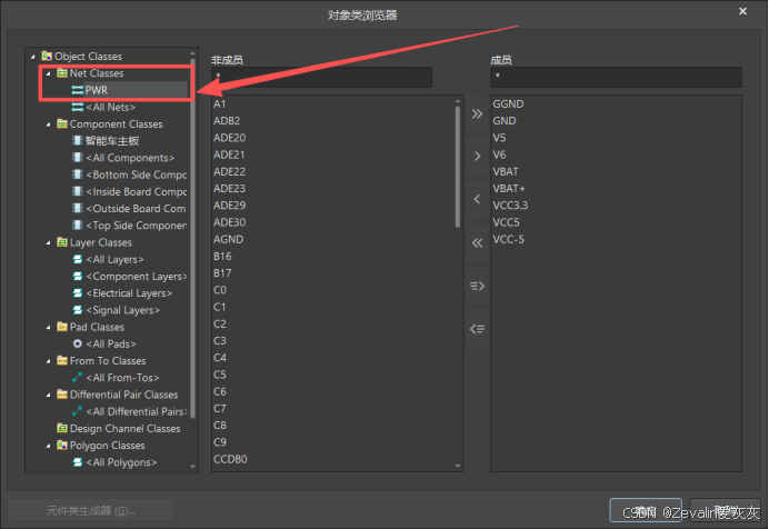 (2)在菜单栏中选择“设计”→“类...”,可以打开对象类浏览器,右键网络类可以新建一个网络类,比如电源网络,然后将电源网络标签添加进类成员即可。