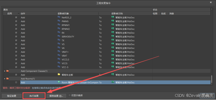 (2)执行上一步操作后,会弹出工程变更指令窗口,逐个变更项进行核对,包括器件、网络等,没有问题即可点击执行变更(Add Rooms可以不勾选,这样就不会执行此项变更)。