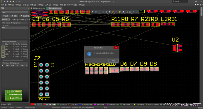 (1)对于一些已经固定好间隔的元件,后续希望移动它们时不会出现单个被打散的情况,这时可以将它们框选,右键选择“联合”→“从选中的器件生成联合”,这样就相当于PPT中的组合功能,只要拖动其中一个元件,另外被联合的元件也会跟随。(PCB中任何组件都可以联合,如导线、丝印等)