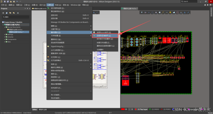 (3)交叉选择模式下无法直接拖动器件,为了把高亮的器件“择出来”,可以在选中模块器件后选择菜单栏中的“工具”→“器件摆放”→“在矩形区域排列”,然后选一块空地拖动一个大小适中的矩形,即可将选中的模块器件全部移动至矩形区域中。