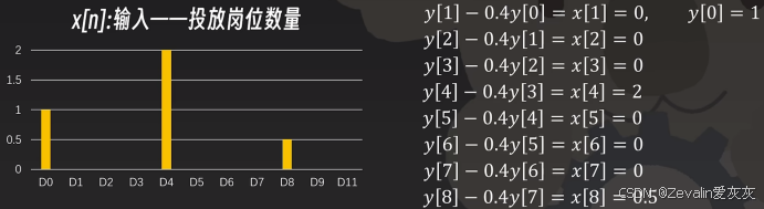 输入冲激函数时,系统会有相应的冲激响应输出,对此可以把系统任何不在第0天的输入都视为冲激函数的移位线性组合,于是可以得到x[n]的表达式,根据线性时不变系统性质,每个冲激函数对应一个冲激响应,于是可以得到y[n]的表达式,可见整个系统的输出其实是三个冲激响应输出的叠加