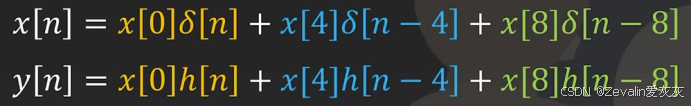 仔细观察求出系统输出的过程,可以得出如下关系式,也就是说,输入信号x[n]是经过线性移位的冲激信号的累加,输出信号y[n]是经过线性移位的冲激响应的累加