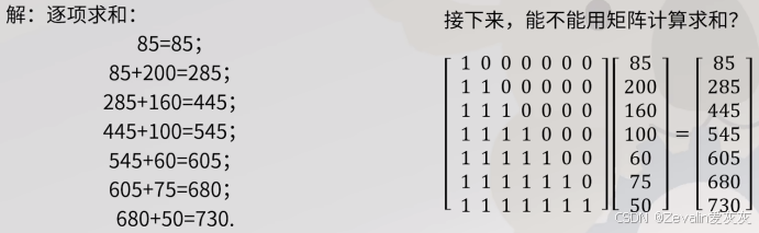 离散的求和就是求一个向量(或者说数列)前n项的和,再举个例子,假设某位同学国庆期间每天的开销分别为85$、200$、160$、100$、60$、75$、50$,要求他这七天的累计开销,可以逐项进行求和,第一项加上第二项求和,再将求和结果加上第三项,以此往复,很显然这也稍微麻烦了一点,对此可以考虑用一个有规律的矩阵计算求和(对计算机来说可提高计算速度),如下所示