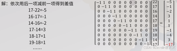 离散的差分就是对一个向量(或者说数列)求后一项和前一项的差,举个例子,假设杭州9月31日起的日最低气温为22℃、17℃、16℃、14℃、17℃、18℃、19℃、18℃、14℃、17℃,要想求每天的最低气温变化差值,可以依次用后一项减前一项而得,这需要列出一条一条的式子,比较麻烦,对此可以考虑用一个有规律的矩阵计算差分(对计算机来说可提高计算速度),如下所示,其中最后一个值-17是一个无效值,因为17℃那天的后一天最低气温无从知晓,只能默认为0℃
