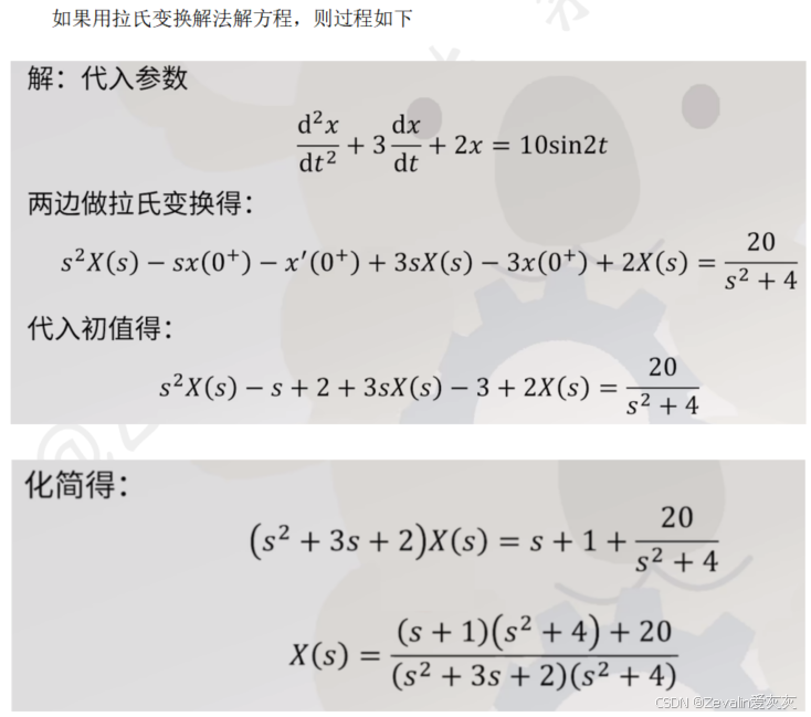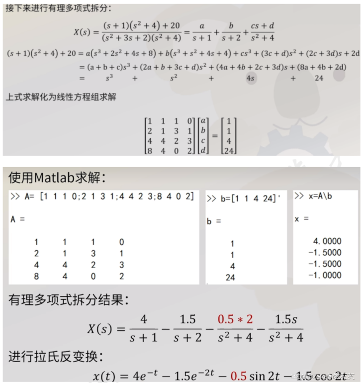 总结一下使用拉氏变换解微分方程流程,将微分方程转化到s域,解s域代数方程,拆分为有理多项式后使用拉氏反变换得到时域解