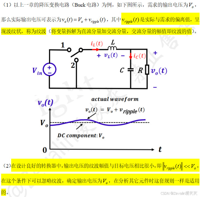 (1)前面在介绍Buck电路的时候仅对电感进行电流纹波设计,并没提及对电容的电压纹波设计,这是因为开关不影响电容的状态方程,但根据基尔霍夫电流定律,可以发现电容的纹波是与电感的纹波有关系的。