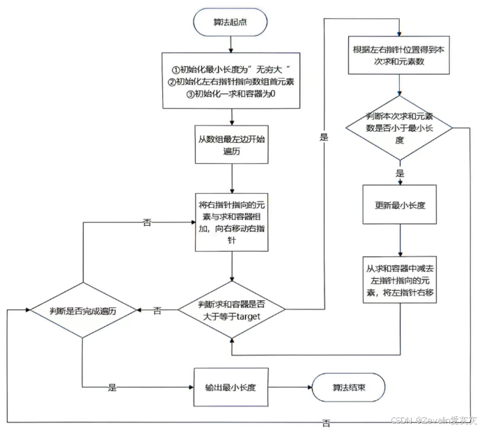 函数作用:找出数组中满足其总和大于等于target的长度最小的子数组