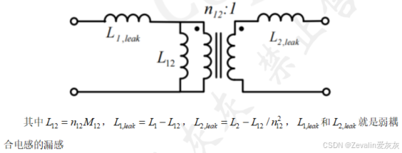 弱耦合电感的模型在电路结构上与强耦合电感模型相似,但它有非常多的漏磁丢失在空气中,不像强耦合电感的两个电感共用一个磁芯,此时不宜用实际变压器的模型对其进行分析