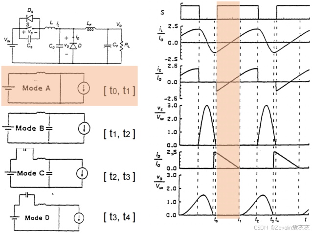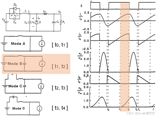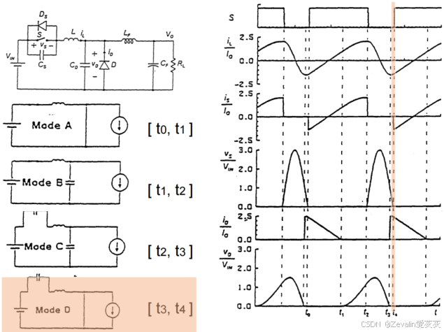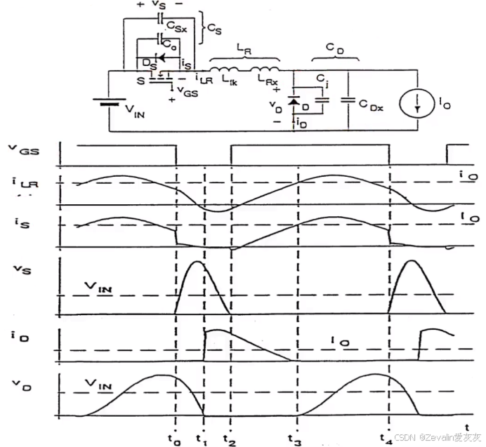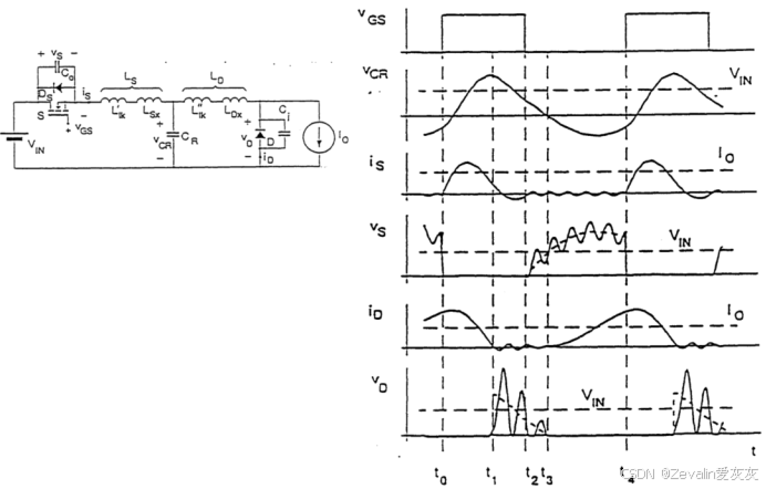 (2)下图所示的是一种实际ZCS准谐振变换器的电路拓扑及波形。