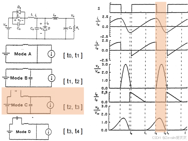 (2)下图所示的是一种实际ZVS准谐振变换器的电路拓扑及波形。