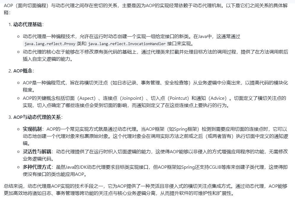 - 代理(Proxy):Spring AOP通常通过动态代理(JDK动态代理或CGLIB)来创建目标对象的代理,以实现在不修改原有代码的情况下插入切面逻辑。