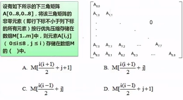 方法二:根据下三角矩阵的行优先压缩存储规则,元素A[i,j]在数组M中的位置需要计算其所在行之前所有行的元素个数之和,加上当前行的位置。由于数组M的下标从1开始,公式需进行调整。