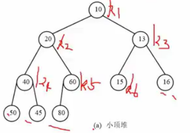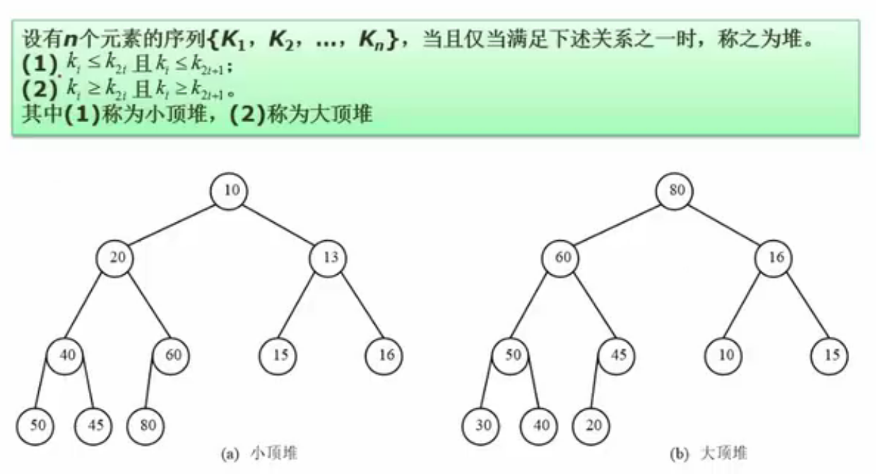 - 小顶堆:每个父节点的值 ≤ 其左右孩子的值(根节点是最小值)。